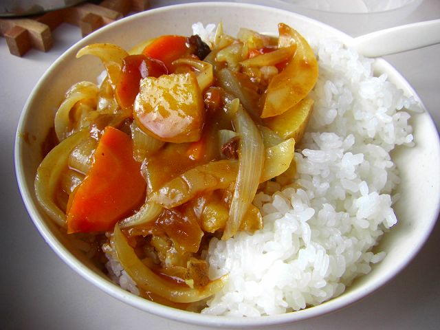 玉ねぎ、人参を炒めレトルトカレーとルーを足して作りました。