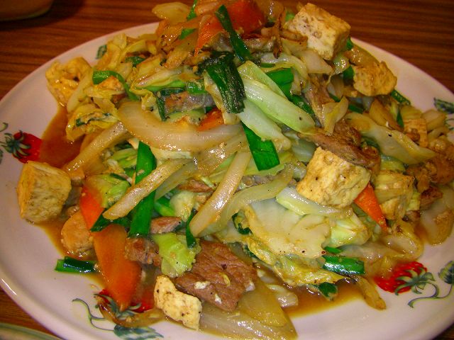 ごま油で炒めてあるものではなく丸ごとかスライスだけしてあるザー菜を千切りにし、竹の子、人参、大根、玉ねぎ、長ネギ、きくらげとお豆腐を入れて塩コショウで味を調整して出来上がりです。溶き卵を入れても綺麗です。