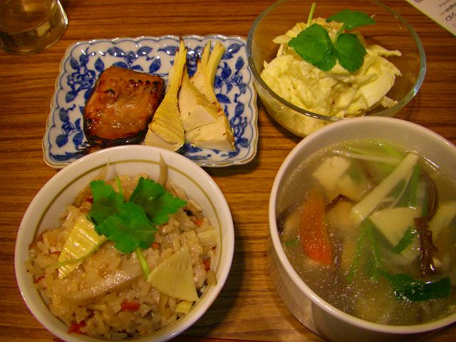 竹の子ご飯にたけのこ入り中華スープ、筍焼、鯖焼、新ジャガのサラダです。