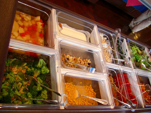 サラダバーはこんな感じ。冷凍野菜が並んでいるファミレスと違って一仕事した野菜やパスタ、ヨーグルトが並んでいます。