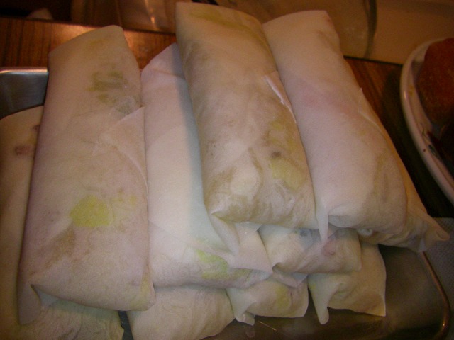 春巻きは、まずは皮をはがすところからが仕事です。コレは1枚ずつはがすのでタマく、10枚をまず半分の5枚ずつ。そして3枚と2枚・・・と言うようにはがしていくと簡単にはがれるんですよ!