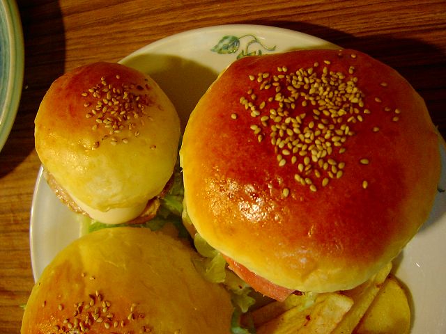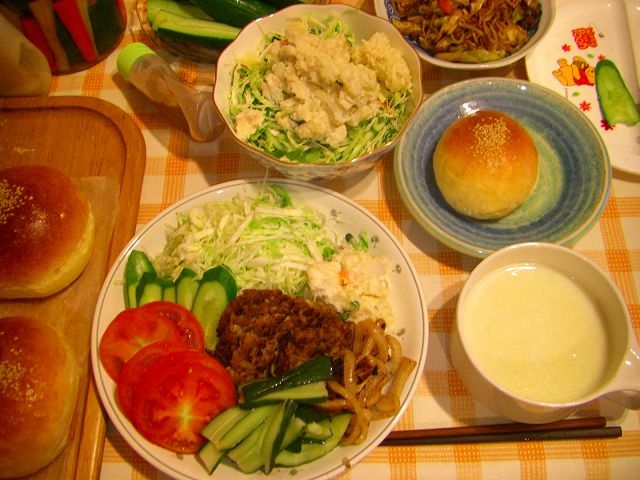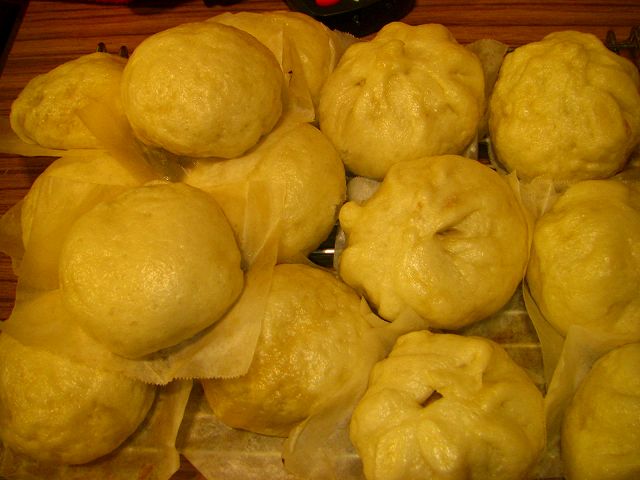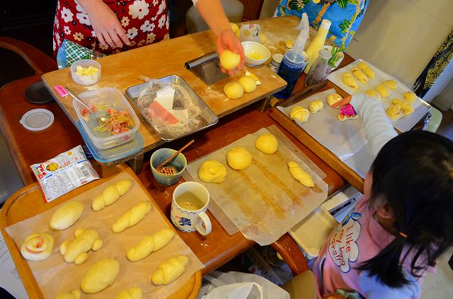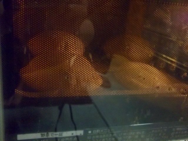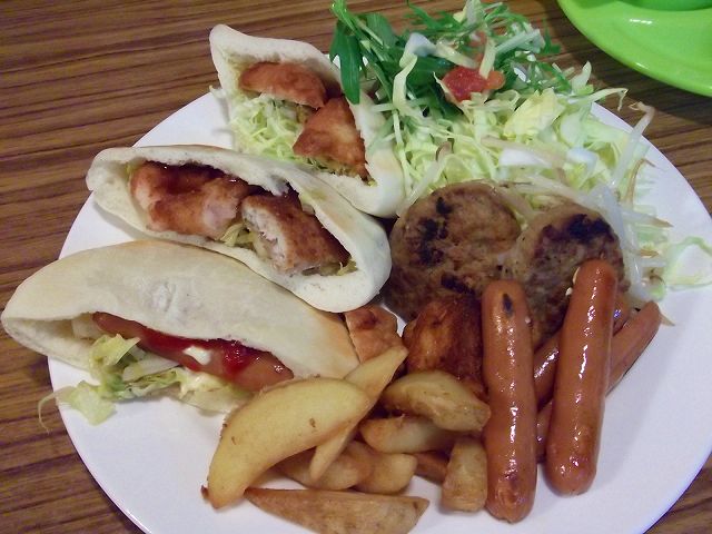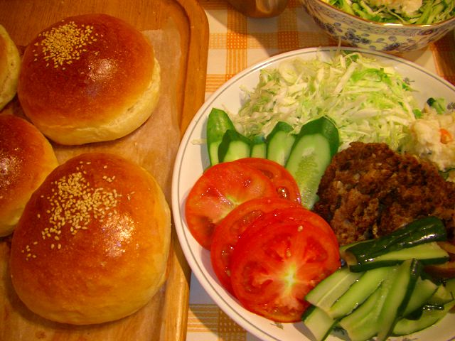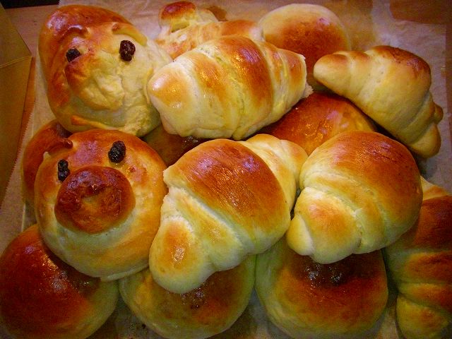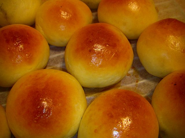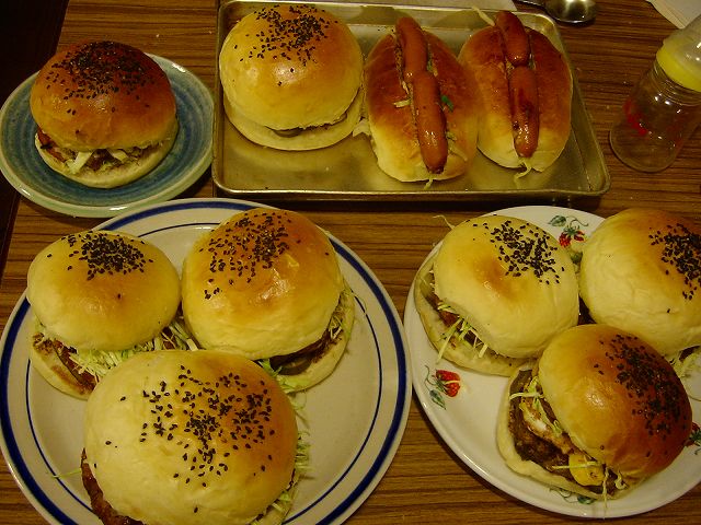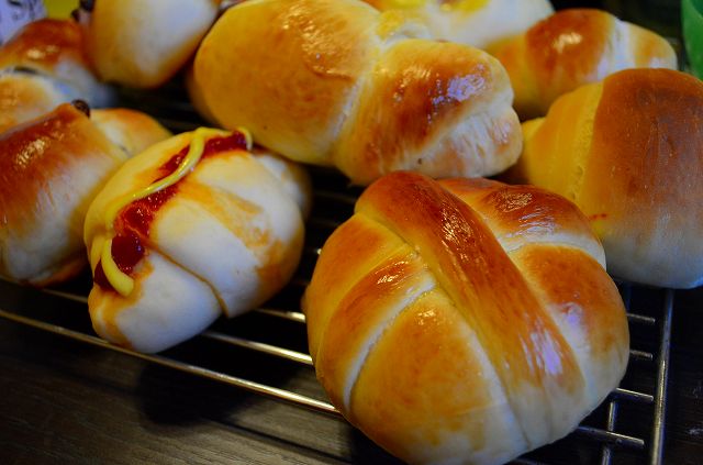 ドッグパン(16個):強力粉480g、砂糖32g、塩8g、イースト10g、ショートニング48g、牛乳300gを良く練って発酵させてから、成型して180度で焼きました。