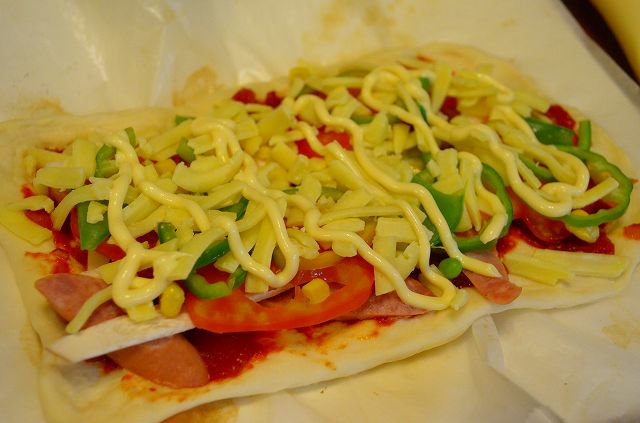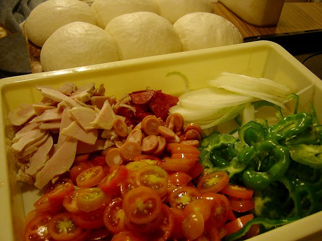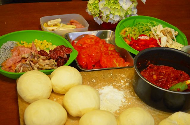 用意したのはピザ生地とトマトソース、ソーセージ、ベーコン、サラミ、しらす、こーん、ポテト、トマト、ピーマン、えりんぎ等など~。