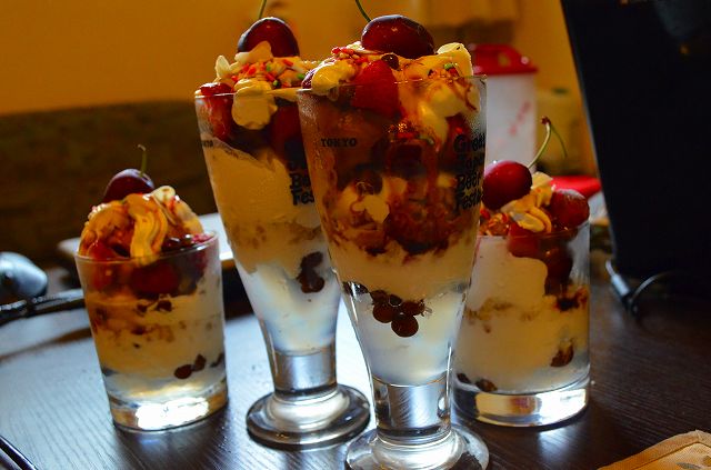 下にみつ豆缶のかんてんと豆をいれ・・・ヨーグルト、グラノーラ(コーンフレークでもOK)と重ねて行き、フルーツ、生クリーム、アイスと2回更に重ねて上部を生クリーム、チョコスプレー、アーモンドスライス、フルーツなどで飾り付けたら出来上がり!!!
