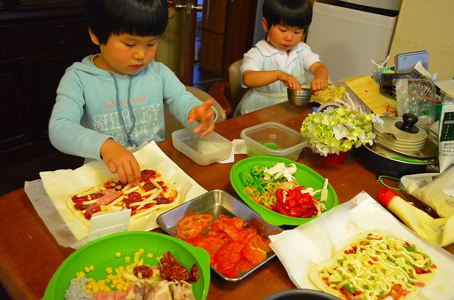 生地を伸ばしてソースを塗った後に色味から乗せる具材をハナに指示~!!
