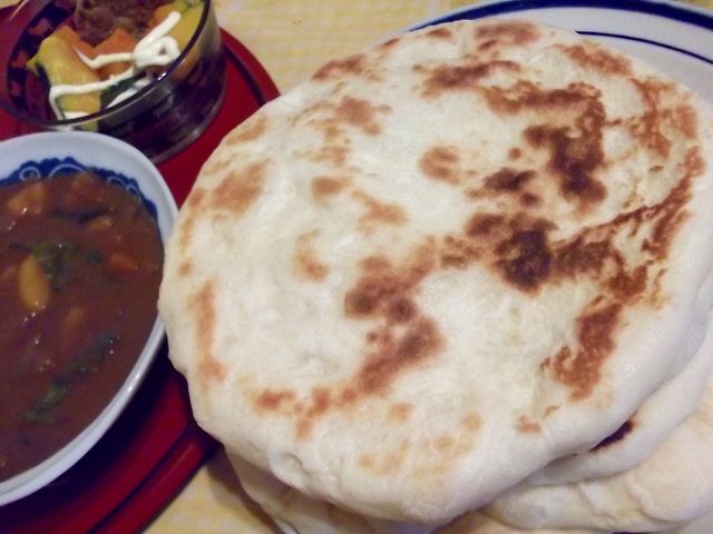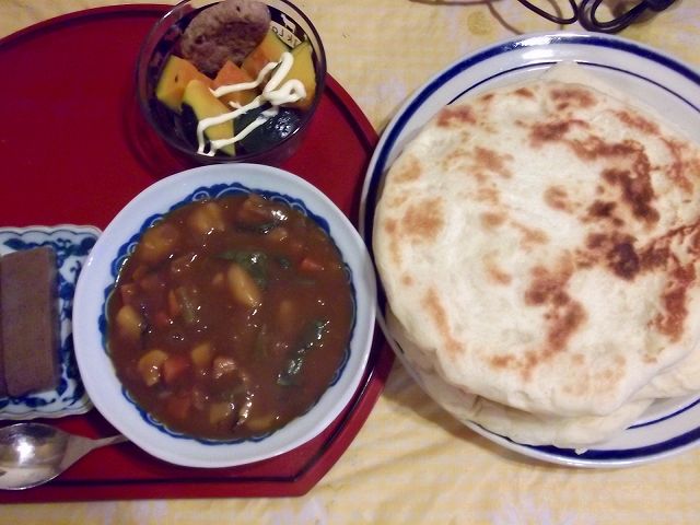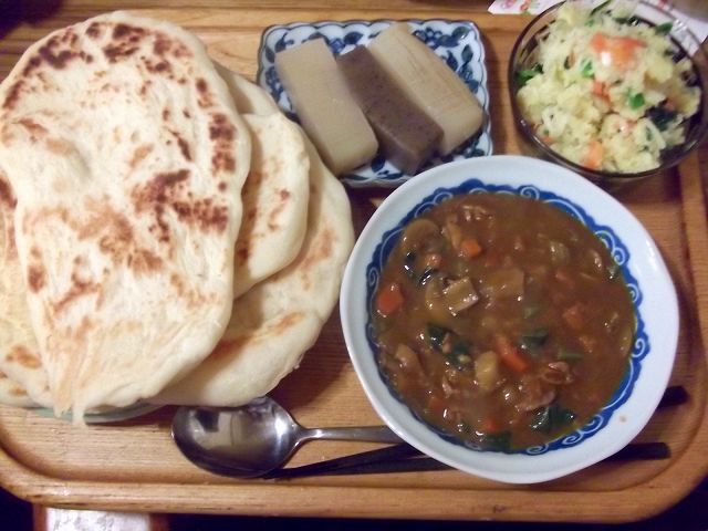 昼のうちにナンの生地を仕込んでおき、昨日のカレーと温野菜のサラダで。