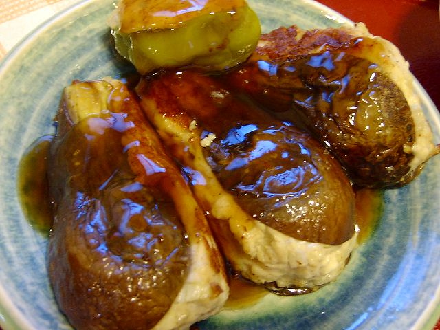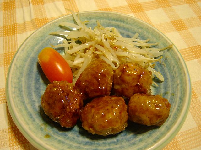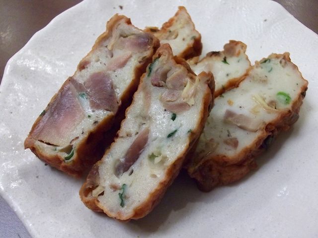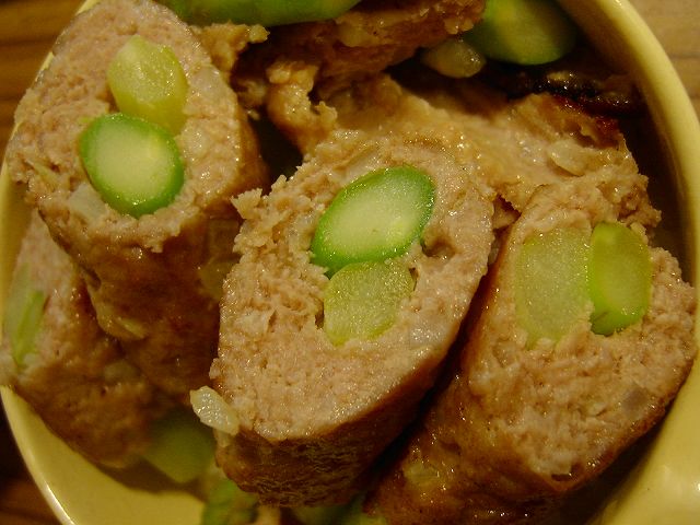 挽肉に竹の子、葱、干し椎茸などと調味料を練りこんで作りました。