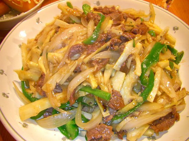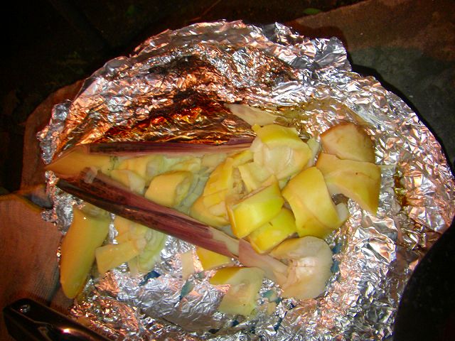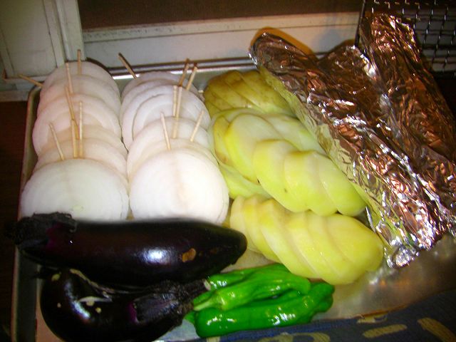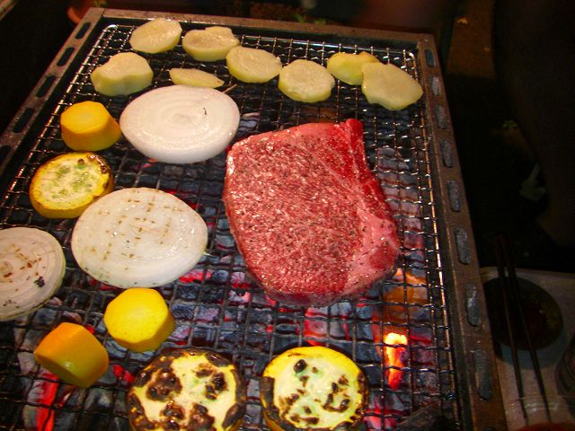 霜降りのステーキ肉に豚バラにカルビにとお肉の他に、畑で取れたチビナス2個とピーマン1個、畑で掘った真竹にじゃが芋、玉ねぎやズッキーニ(↓黄色いの)などを焼きました。