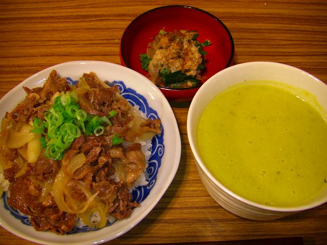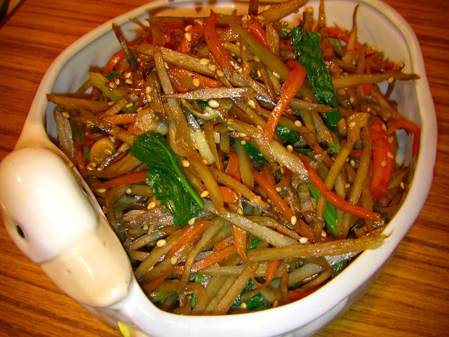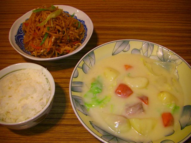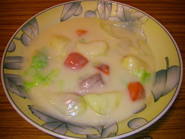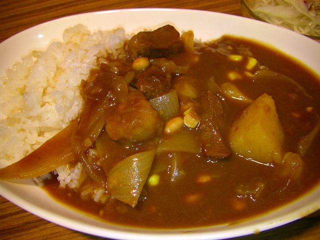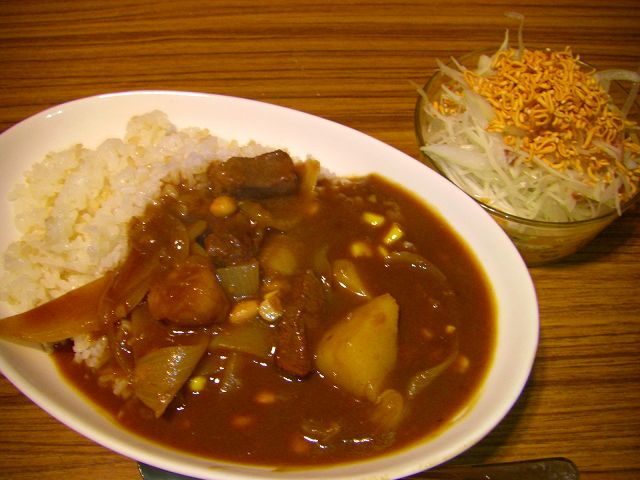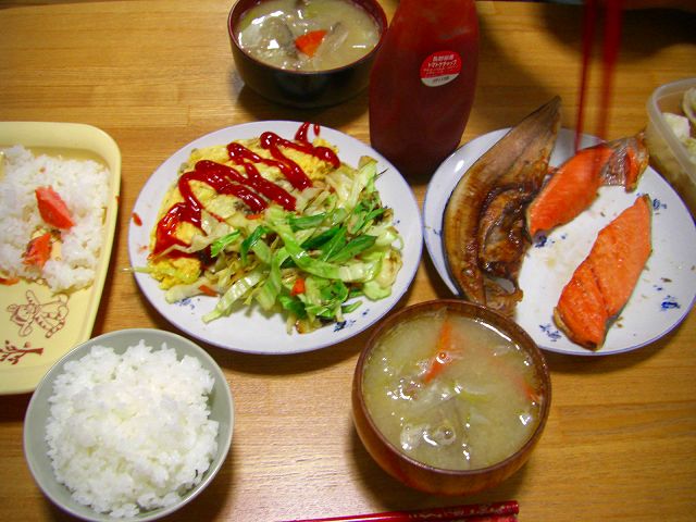 先日TVでやっていたものがじゃが芋と卵だけだったので、オニオンスライスとキャベツを足して彩りと歯ごたえを足しました。でもキャベツは色が埋まっちゃった~^^;