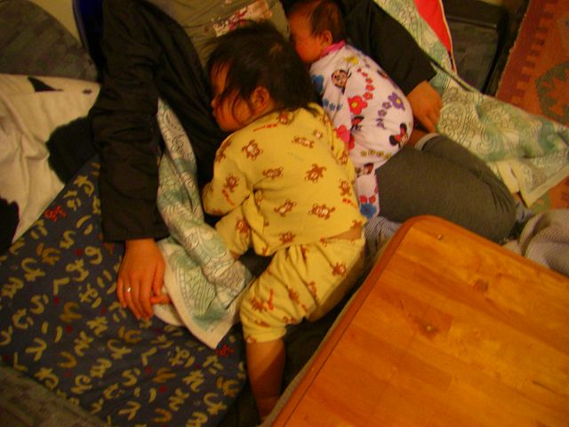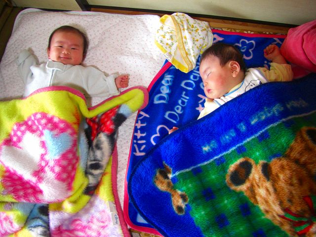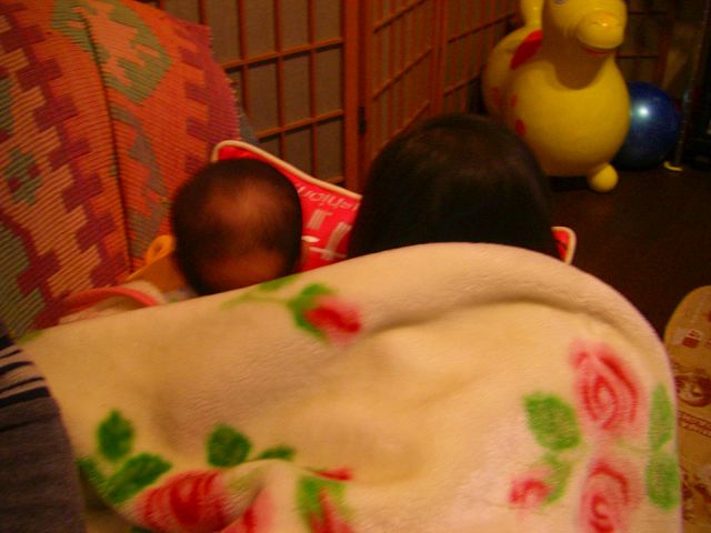 10時に寝かしつけていたんですがなかなか寝ない・・・諦めてリビングへ戻ってきて、夫に存分に遊んでもらった後です。置かれたモモの横にタマが潜り込んで添い寝??してました~☆