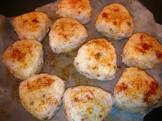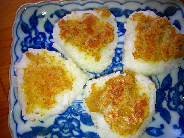ご飯に、シラス、大葉千切り、白胡麻、鰹節を醤油に浸した物を混ぜて握り、醤油を塗って表面をこんがり焼くのです。今回は大葉がもう無かったので紫蘇の実を刻んで混ぜました。