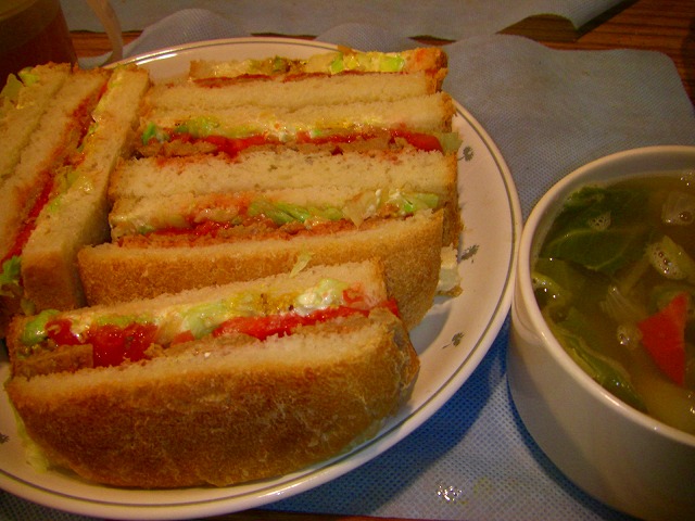 夕食は自家製のふわふわ食パンでサンドウィッチです。スープは野菜たっぷりの春キャベツのスープです。ふわふわ食パンのレシピはこちら |