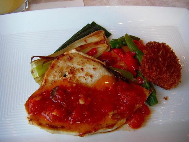 そして魚のランチを頼んだのですが、今日のお魚は「カジキのトマトソースとホタテフライ」です。カジキはつるっとした感じでハナも気に入ったらしく半分ほど食べちゃう勢いでした。ホタテはちょっと揚げ過ぎだけれど、甘みのある厚いホタテで美味しかったです。