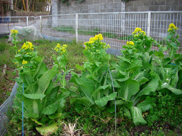 全体を見るとこんな感じです。下の方がちょっと白菜っぽいでしょ!肥料をあげずに育ててみたら白菜にならないまま・・・花が咲いてしまったので、蕾の部分と若い葉を頂きました。若い白菜の葉ってサラダにもなるし美味しいんですよ!