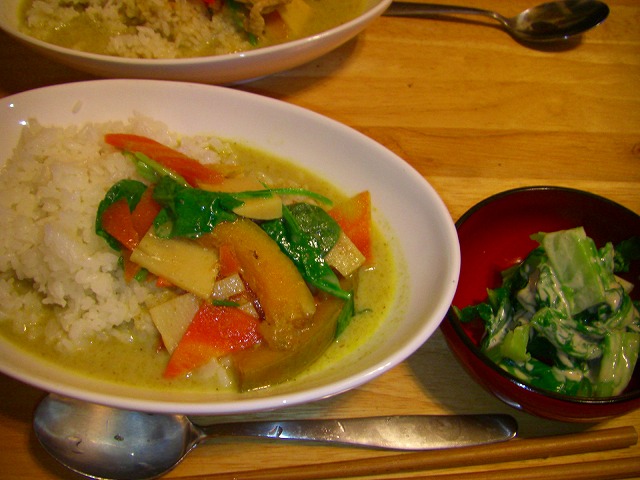 昨日一昨日は続けてグリーンカレーでした。一昨日出かける前に大量に作っておいたものです。先日上野で買った大容量のペーストを使いました!一緒に添えたのは・・・白菜のお浸しです。ゴマドレッシングで頂きました!