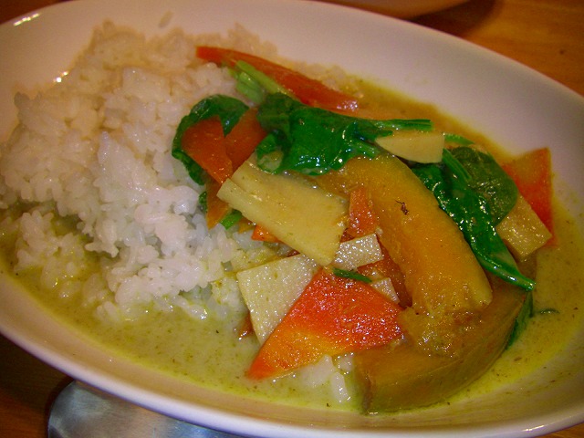 グリーンカレーは材料に火が通れば出来てしまうのでとっても簡単です。具材は基本的には夏のものがあいます。ナスとかピーマンとか・・・。でも今はそれらの野菜は高いのであるもので!!鶏肉と人参にゆで筍、かぼちゃにほうれん草です。筍は必須です☆グリーンカレーのレシピはこちら