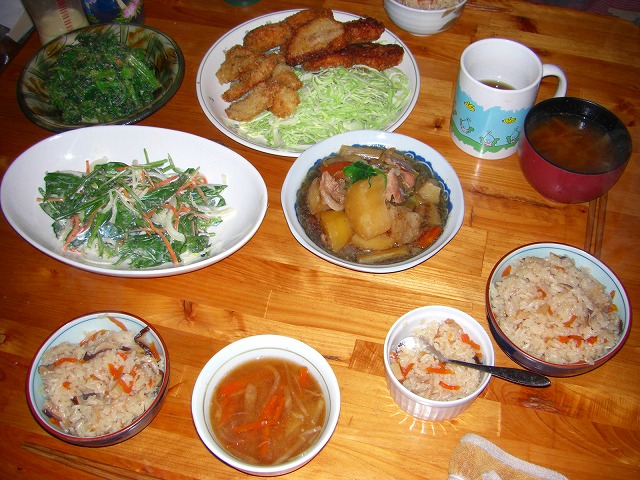そして夜はこんな感じです。揚げ物が好きな義母へひれカツと白身フライ、そしてほうれん草を沢山頂いたので胡麻和えとサラダ。そして和食党の義父が来ると聞いていたので、肉じゃがと炊き込みご飯も作りました。★美味しそうと思ったら★
