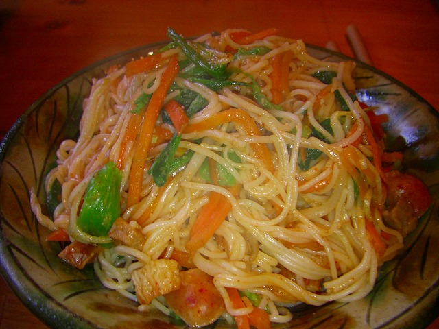 ナムルと素麺を炒めて、酒、塩コショウ、醤油、コチュジャンを入れて炒め最後にごま油を少したらして出来上がりです。適当に作った割りに美味しく出来ました。素麺が余ったときにはお勧めです♪