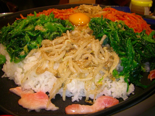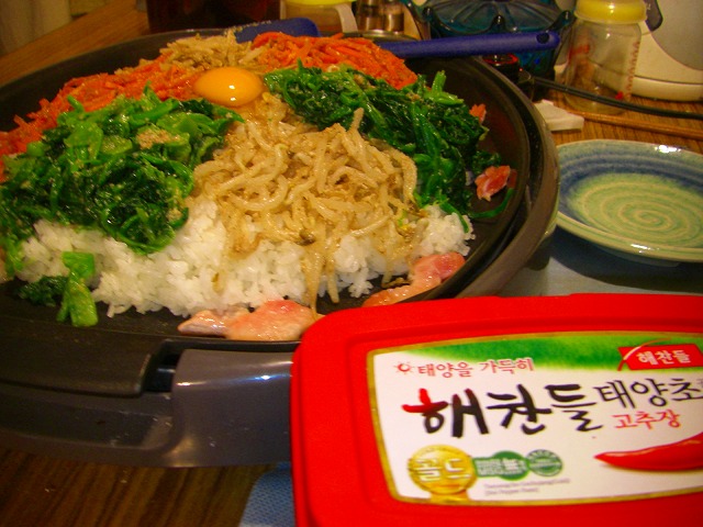 そして夜は昨日食べ損ねたビビンバです。人参とほうれん草が山のようにある我が家にはぴったりのご飯です。今回はそぼろが無いので豚肉を端で焼いてみました。