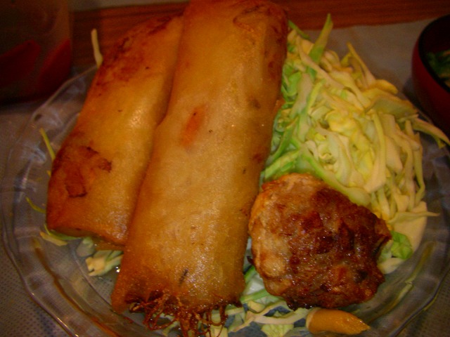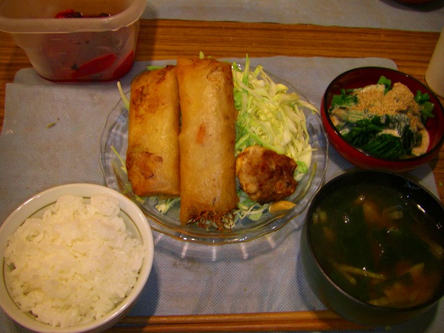 そして今日の夜ご飯です。みずりんさんのお家に5時過ぎまでお邪魔しちゃったのですが・・・昼間のビーフンは夜に春巻きに化けるために仕込んでおいたもの!春巻きとキャベセン、ほうれん草のおひたしにお味噌汁のご飯です。