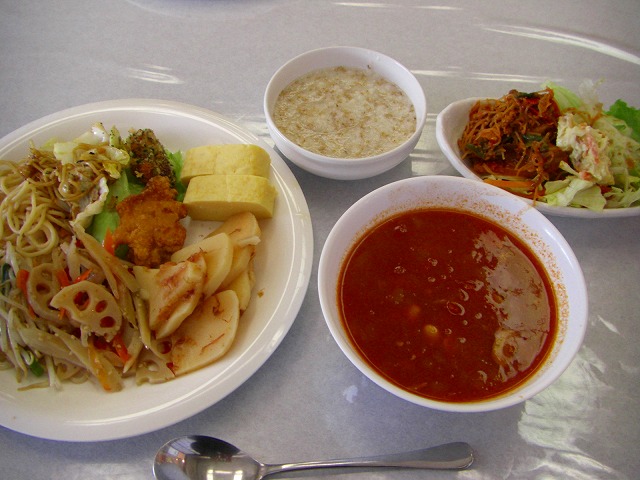 お好み焼き、やきそば、チャーハン、鶏肉のインド風、ピザ、フォー、パスタ2種、鶏のから揚げ、オニオンリング、野菜のてんぷら2種。そのほかに和食で野菜の煮物、切干大根や、梅干、出し巻き卵などとオレンジ、パイン、パンナコッタ、イチゴジャムケーキ、ぜんざいとクッキーやピーナツ等がありました。