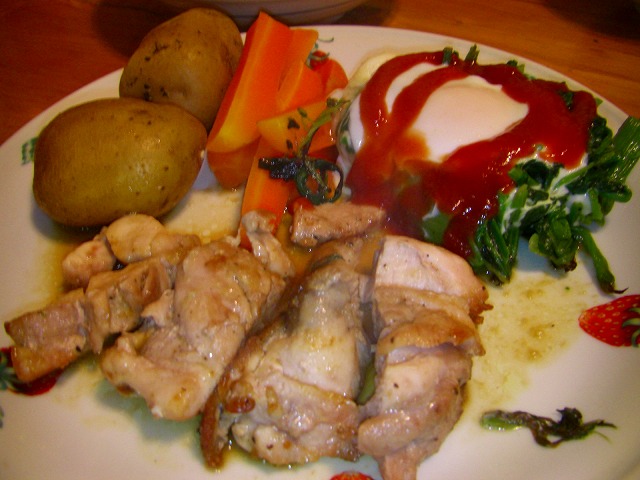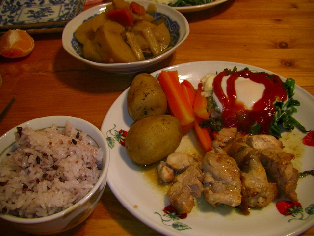 お昼に遅めのランチで一杯食べたので、夕食は簡単に9時過ぎに頂きました。赤米ごはんと肉じゃが、鳥のわさびソース焼き、そして今日オイシックスで届いた人参とジャガイモの温野菜に巣篭もり卵です。