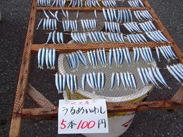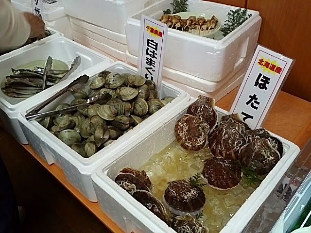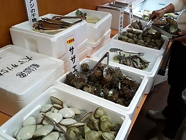 どんなものがあるか覗かせてもらうと・・・ホタテに白ハマグリ、粒貝串にサザエ、大アサリ秋刀魚や鯵の干物のようなものもありました。これはすごい!!