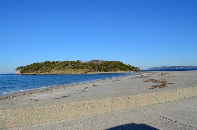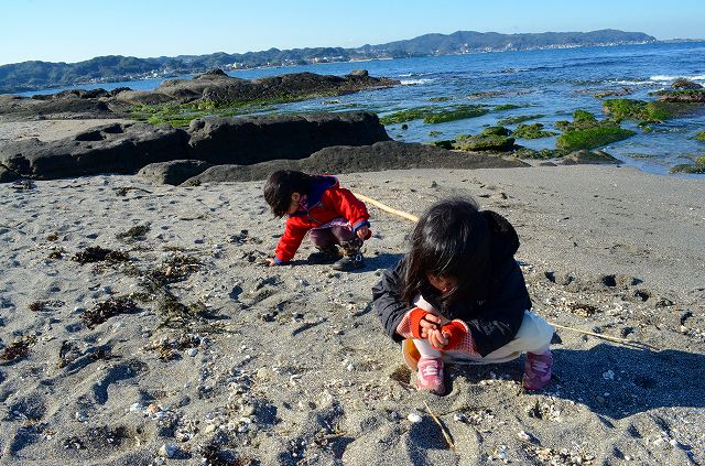 その後、地図左手の浜へ行くと・・・青い海!白い砂浜!遠くには大島や伊豆半島に富士山も見えます。磯も水が綺麗で波も荒くなく絶好の遊び場です。
