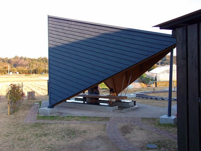 奥にはカッコいい屋根の付いた足湯があります。歩いた足に心地よい♪