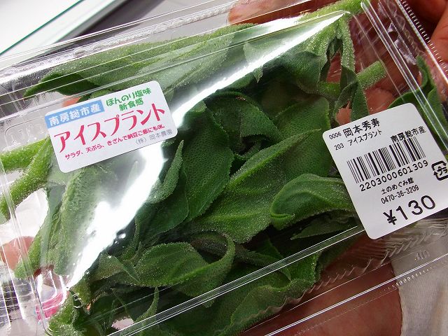 これはアイスプラントという葉っぱです。葉や茎に水滴?氷?という様な粒が付いていて、これがほんのり塩味を感じるらしく、そのまま食べられるそうです。